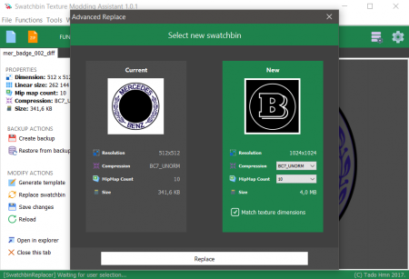Advanced replace options : Gives opportunity to set your new texture compression method, maximum count of mip maps and dimension match